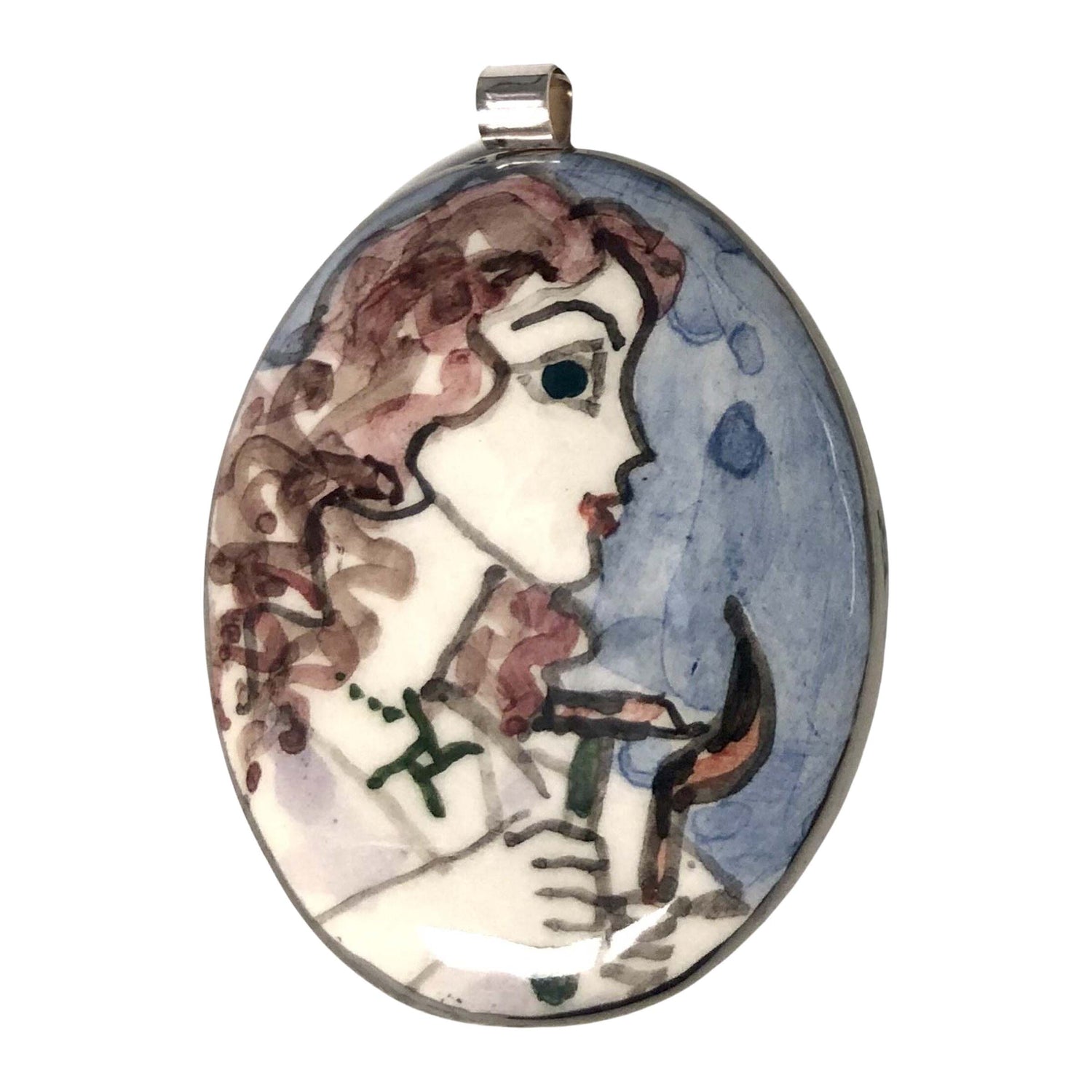 One of a kind, hand-painted, ceramic pendants made by Croatian artist Rok Zelenko depicting Brigid, the Irish goddess of Wisdom, Poetry, and Handicraft.