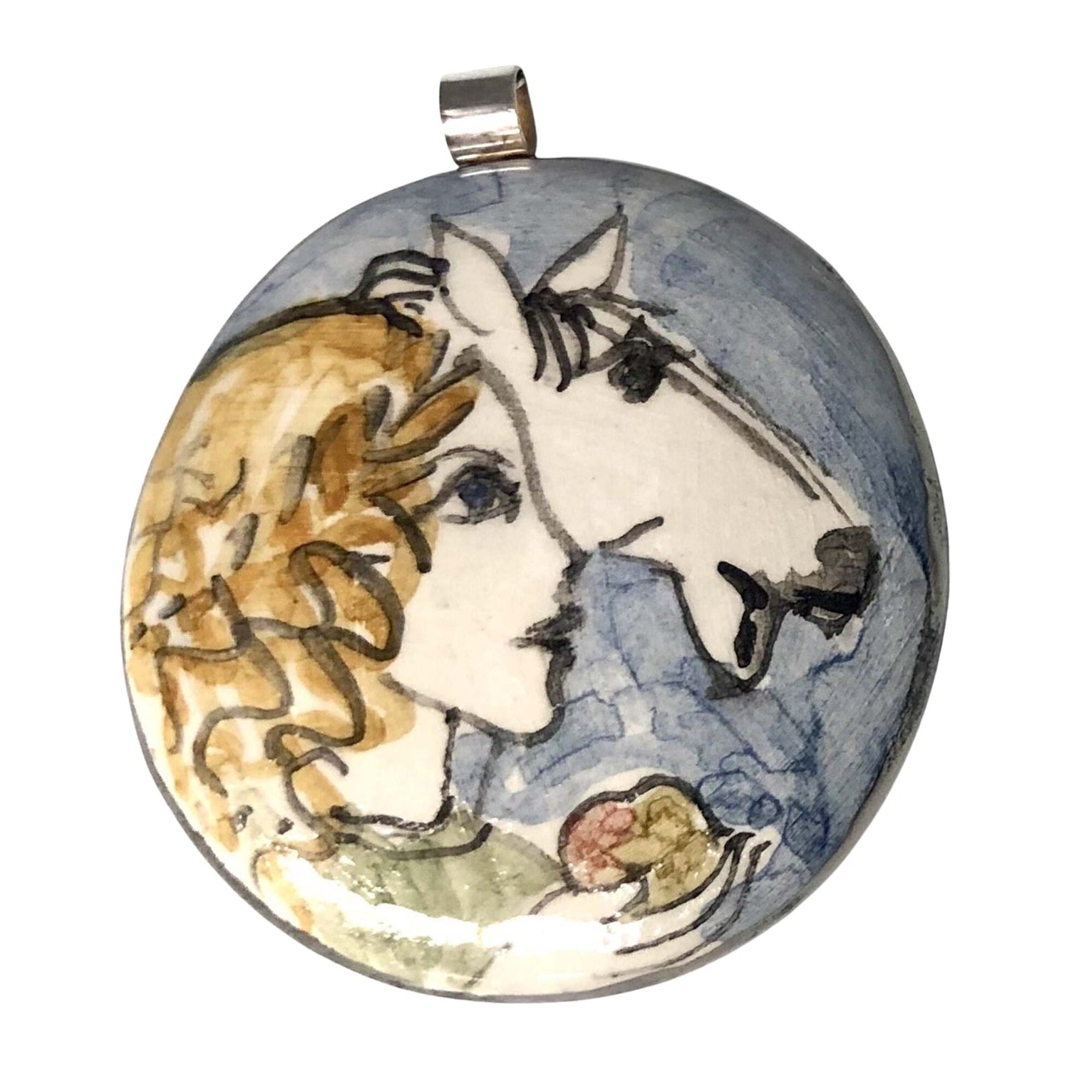 One of a kind, hand-painted, ceramic pendants made by Croatian artist Rok Zelenko depicting Epona, the Gallo-Roman goddess of Horses, Donkeys, Mules, and Equestrianism.