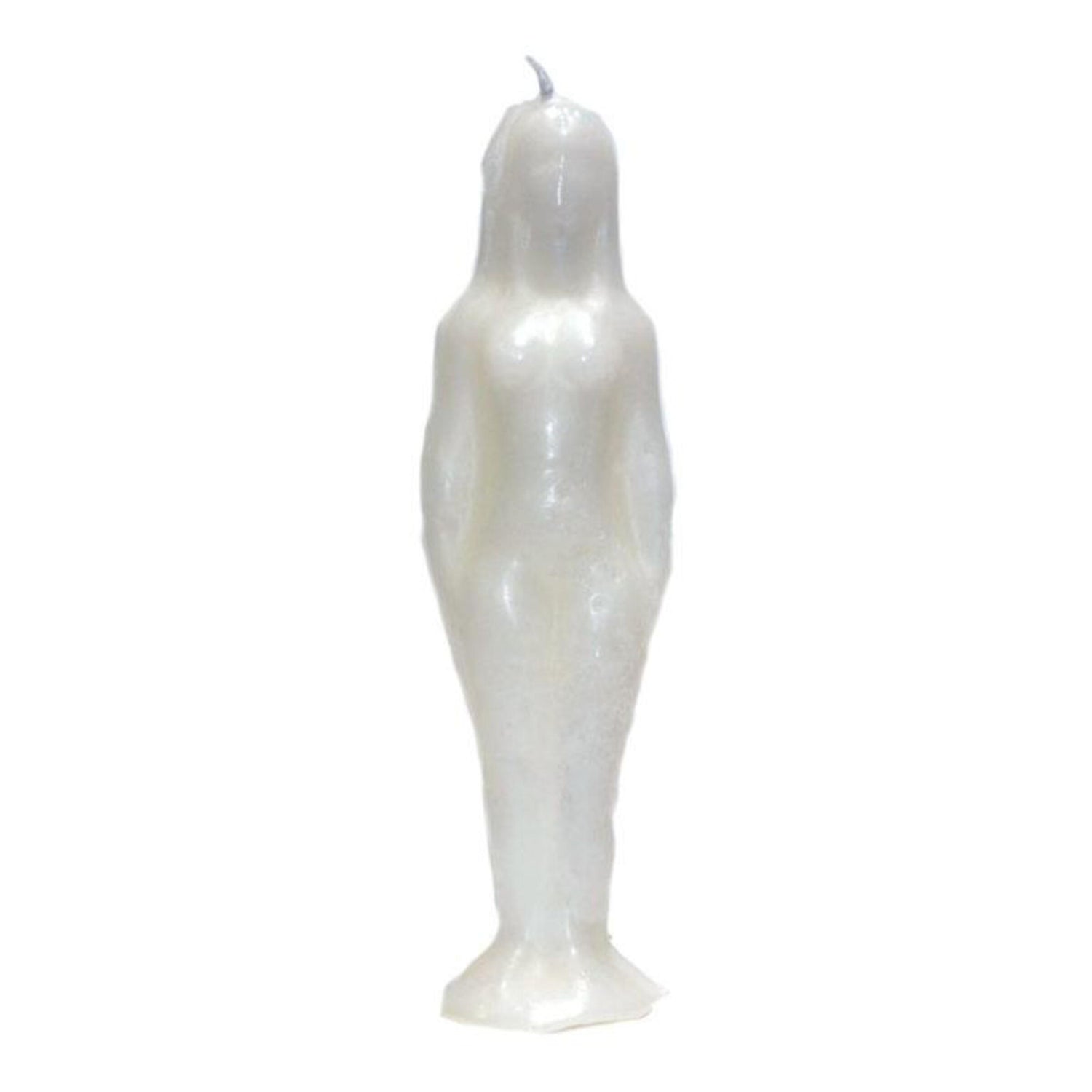 This candle is molded to represent a naked woman. The name of the person the candle represents should be etched on the chest of this candle. Burning a white female may be useful for workings around light, innocence, purity, safety, and cleanliness. Dual-use could be as a poppet. The candle may require leveling to stand perfectly straight. 7" by 2 1/4".