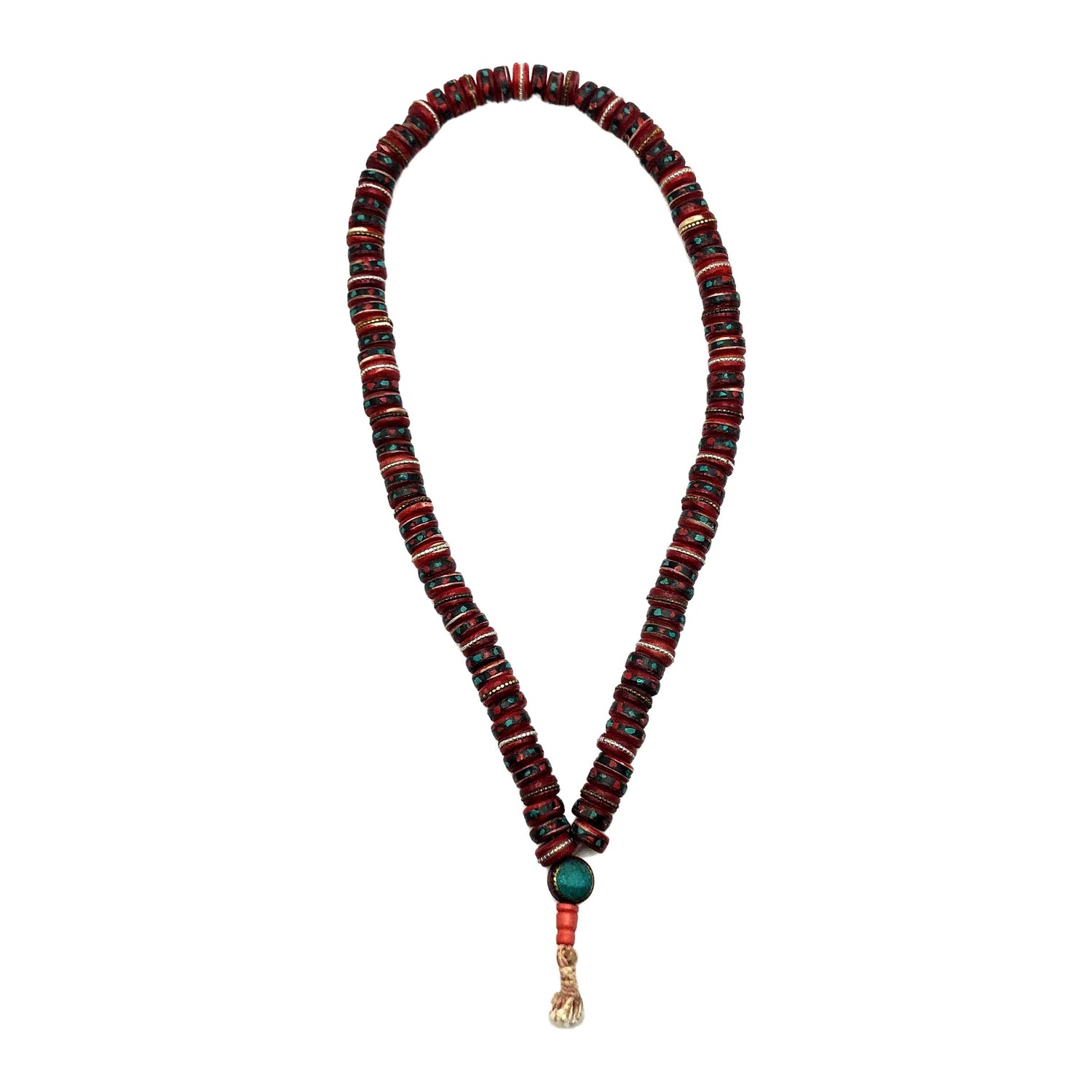 This antique-style 108 bead mala is made with naturally dyed yak bone beads that are inlaid with pieces of turquoise, coral, copper and brass.