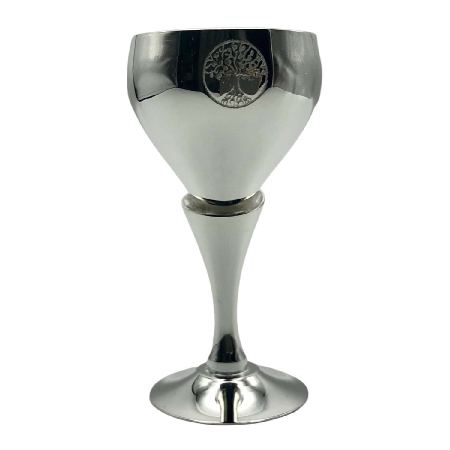 Silver plated chalice with the tree of life carved into it, 3 1/4'' tall. Chalices and Altar Cups are often used in ritual ceremonies and formal settings for purification and consecration.