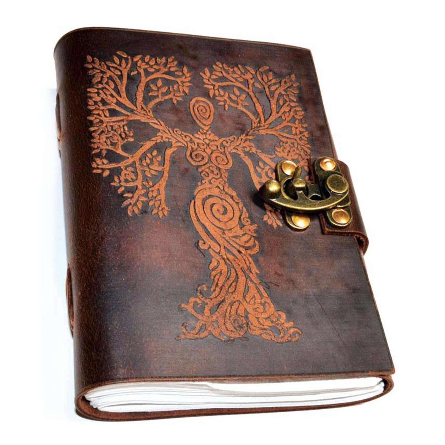 Tree of Life leather journal with an aged distressed finish. Woman's shape created through the image of a tree is on cover is in a lighter leather creating a beautiful contrast. 5" x 7" with 120 pages of unlined parchment paper and a latch closure.