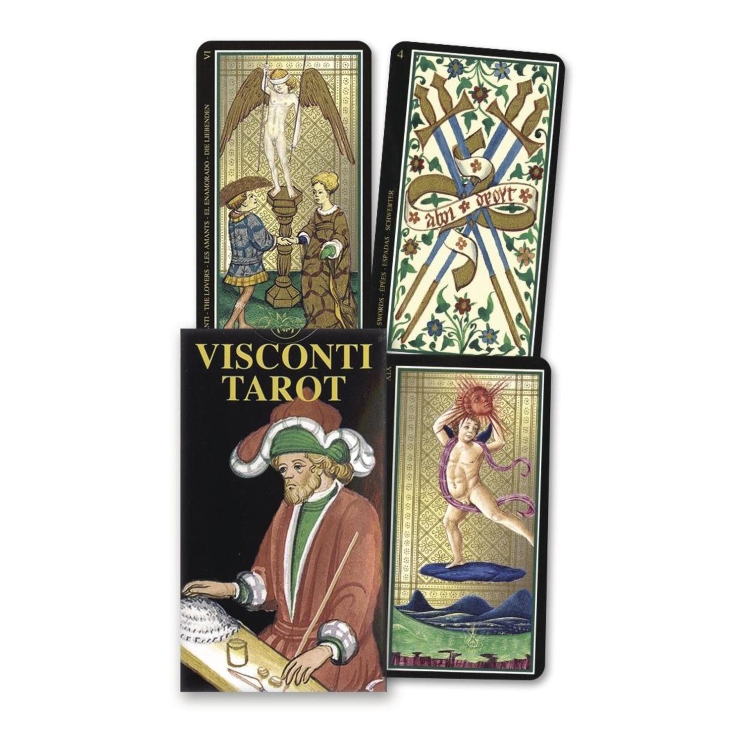 One of the oldest Tarot decks preserved to this day and perhaps the most beautiful of all...these cards are universally recognized as one of the most extraordinary examples of miniature art and Renaissance symbolism. The Visconti Tarot, which has been restored and printed with gold to enhance its original splendor, is now available in a new miniature size.